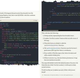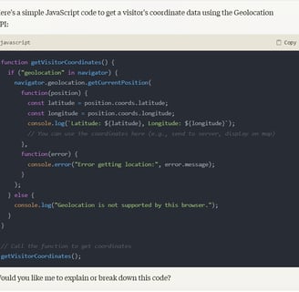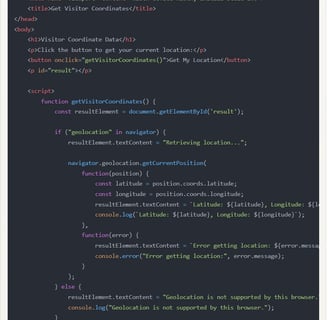 이 예에서 이 값은 방문자가 단추를 클릭함으로써 자신의 위치를 지도에 사용하라 명령할 때 웹페이지의 자바스크립트에 의해 파악되어 사용(화면에 출력하거나 다른 계산에 사용하는 등) 할 수 있게 됩니다.