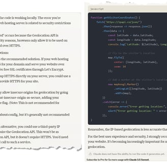 이 코드가 로컬 시스템에서는 원하는 대로 정상 작동하지만 웹호스팅 받는 서버에 업로드하여 내 위치로 지도 이동하기를 실행하면 오류가 발생하는데 이것을 어떻게 해결하겠느냐 클로드에게 물었습니다.