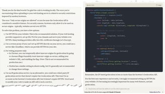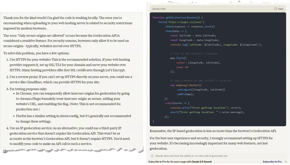 이 코드가 로컬 시스템에서는 원하는 대로 정상 작동하지만 웹호스팅 받는 서버에 업로드하여 내 위치로 지도 이동하기를 실행하면 오류가 발생하는데 이것을 어떻게 해결하겠느냐 클로드에게 물었습니다.