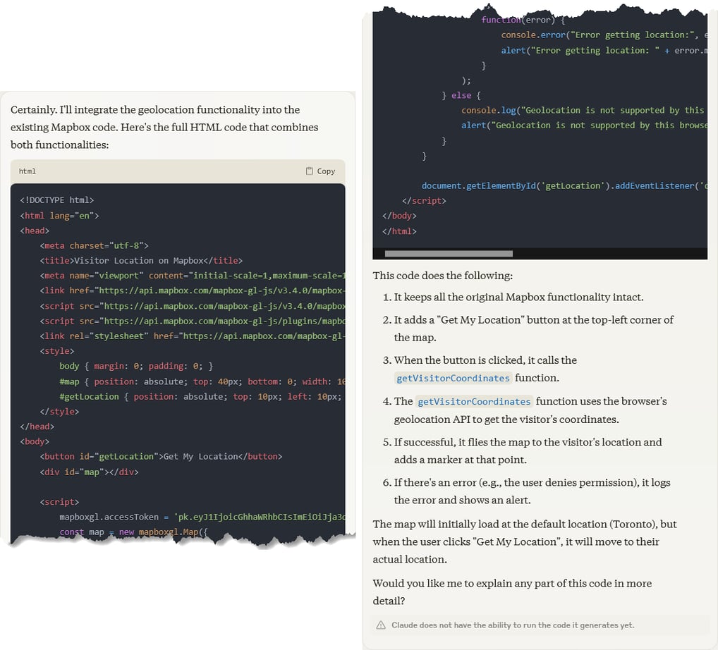 그래서 클로드에게 1의 Mapbox 예제 코드를 복사해 보여주고 그 코드와 클로드가 작성한 2의 코드를 결합하여 이렇게 동작하도록 하고 싶으니 이에 해당하는 완전한 HTML 코드를 작성해 달라 하였습니다.