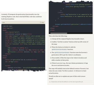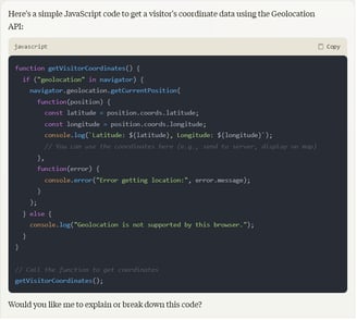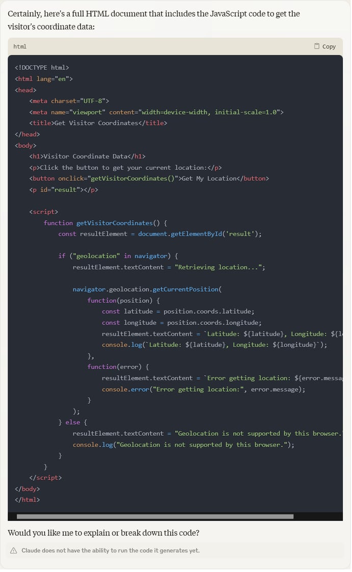 이 예에서 이 값은 방문자가 단추를 클릭함으로써 자신의 위치를 지도에 사용하라 명령할 때 웹페이지의 자바스크립트에 의해 파악되어 사용(화면에 출력하거나 다른 계산에 사용하는 등) 할 수 있게 됩니다.
