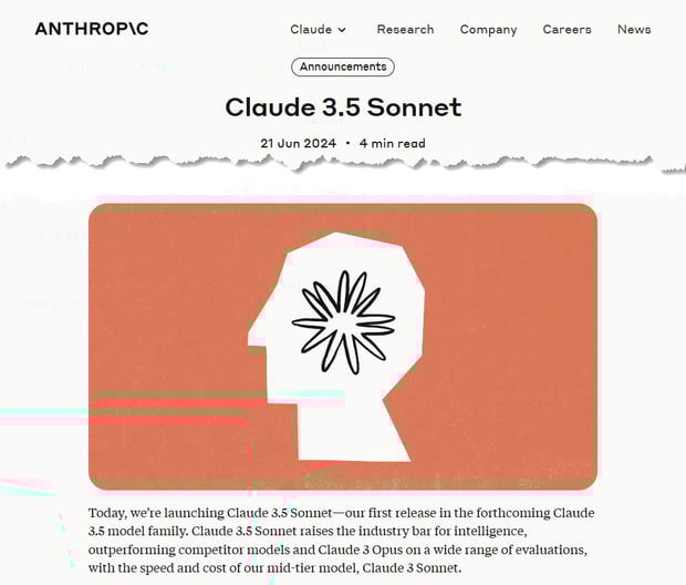 앤스로픽(Anthropic)은 최근(2024-06-20) 기존 모델보다 크게 개선된 클로드 3.5 소네트(Claude 3.5 Sonnet)를 공개하였습니다.